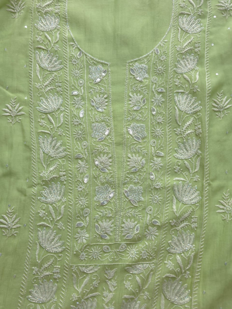 Kurta : Semi stitched with extremely fine chikankari on Font adorned with Heavy pearl cutdana and sequin work, Elegantly made neck yoke followed by front panel embellished with heavy cutdana and pearls, side panels with exquisite handwork with embellishment Sleeve: Heavy long sleeves