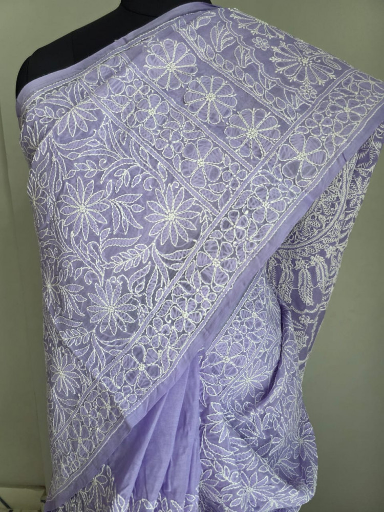 Color : LavenderFabric : Cotton voil soft Details: Heavy and intricately fully Hand embroidered, all over fine floral fine jaalwork on saree , heavy anchal and body full embroidered Blouse : attached with embroidered sleeves Disclaimer : Actual color may vary slightly