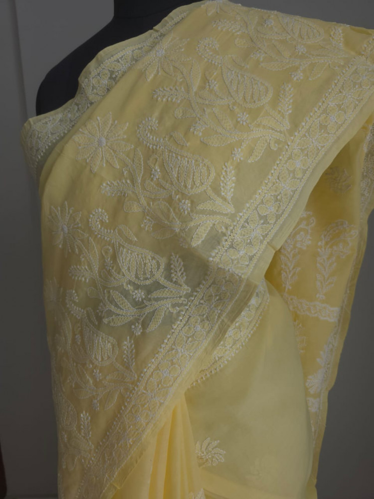 Details : Heavy and intricately Hand embroidered Anchal, body with Broad Skirt Floral border and butis all over, superfine handwork with delicate stitches