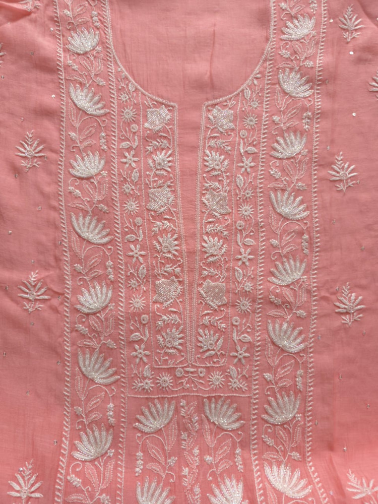 Kurta : Semi stitched with extremely fine chikankari on Font adorned with Heavy pearl cutdana and sequin work, Elegantly made neck yoke followed by front panel embellished with heavy cutdana and pearls, side panels with exquisite handwork with embellishment Sleeve: Heavy long sleeves